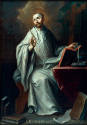 Se encuentra representado de cuerpo entero y de tamaño natural, sentados en ambientes íntimos, ante sus mesas de trabajo y rodeados de libros. El lienzo estuvo destinado a los salones de la Universidad se ha dicho que representan ese refinamiento religioso e intelectual que debió vivirse en la Nueva España, tanto entre los miembros del culto clero, como entre los de aquella institución, ámbitos en los que se combinaba lo cortesano y lo eclesiástico con el mundo de las letras.17 Ambos santos están representados en su calidad de escritores con la pluma en la mano, como esperando la inspiración o poniendo en orden sus ideas; pero mientras que san Bernardo eleva su mirada hacia el rompimiento de gloria, para subrayar que su sabiduría proviene del cielo ("ciencia infusa"),