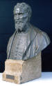 Este busto en bronce no sostiene por sí mismo, necesita de un pedestal para permanever vertical. El rosto de Miguel Ángel está rodeado por una cabellera ondulada y una tupida barba esconde su boca. Su gesto adusto se acentúa al juntarse el ceño, lo que realta las cejas: la nariz es priminenbte. Porta un traje con una prenda abotonada casi por completo, ya que el escultor ha dejado un botón a medio abrochar: Sobre la sayuela lleva un holgado paletó de amplias mangas. En cuento a la factura: se percibe perfectamente la unión entre las dos mitades que forman el conjunto y que no fue pulida una vez sacadop el molde: en la cabellera sobresalen también residuos de bronce no limados.